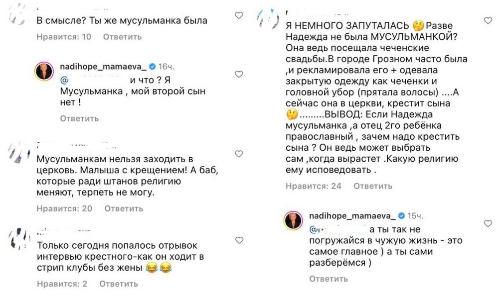 «Я немного запуталась. Разве Надежда не была мусульманкой? Она ведь посещала чеченские свадьбы, в городе Грозном часто была и рекламировала его, плюс надевала закрытую одежду как чеченки и головной убор (прятала волосы)... А сейчас она в церкви, крестит сына… Вывод: если Надежда - мусульманка, а отец 2-го ребенка православный, зачем крестить? Он ведь может выбрать сам, когда вырастет, какую религию ему исповедовать», - поинтересовалась одна из подписчиц.
