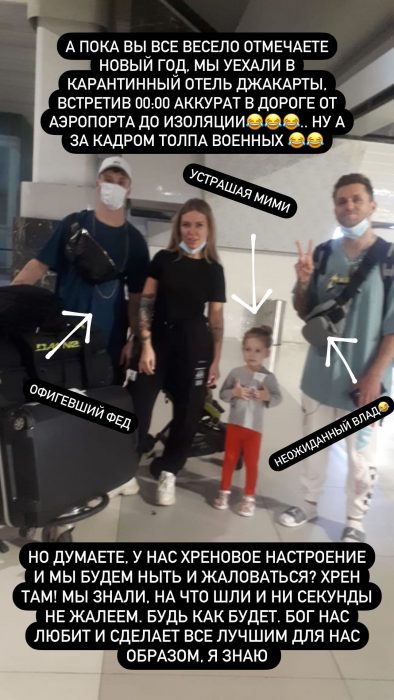Дело в том, что с 1 января Индонезия закрыла въезд для иностранных туристов из-за пандемии коронавируса, и певице с бойфрендом пришлось экстренно менять билеты и собирать чемоданы, чтобы успеть прилететь на Бали. Правда певице не повезло, и Новый год она встретила по пути в карантинный отель Джакарты, где туристам нужно было провести несколько дней в самоизоляции.
