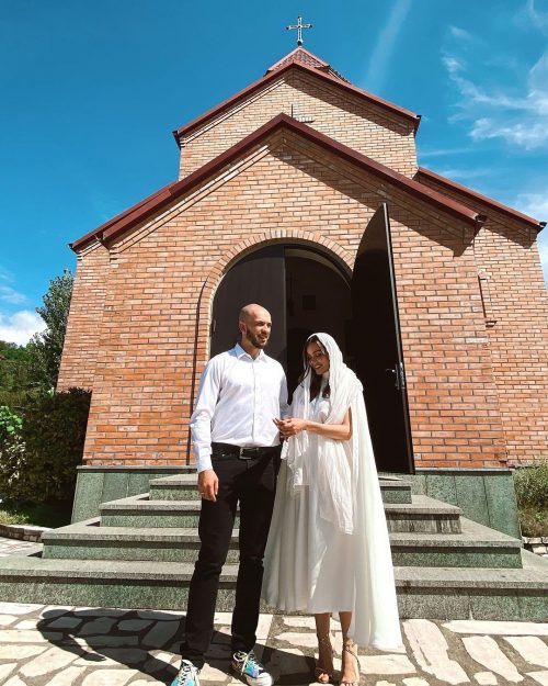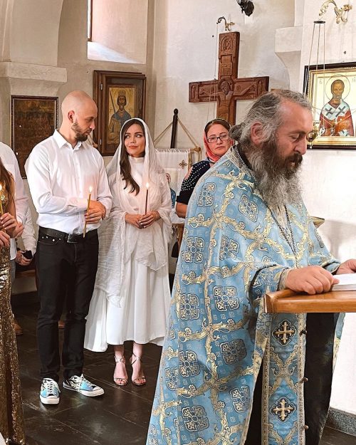 На таинство венчание супруга рэпера надела белое платье с поясом и накидкой, дополнив образ золотыми босоножками на шпильке и белым платком. Александр выбрал классическую белую рубашку и черные брюки, но предпочел цветные кеды обычным ботинкам.