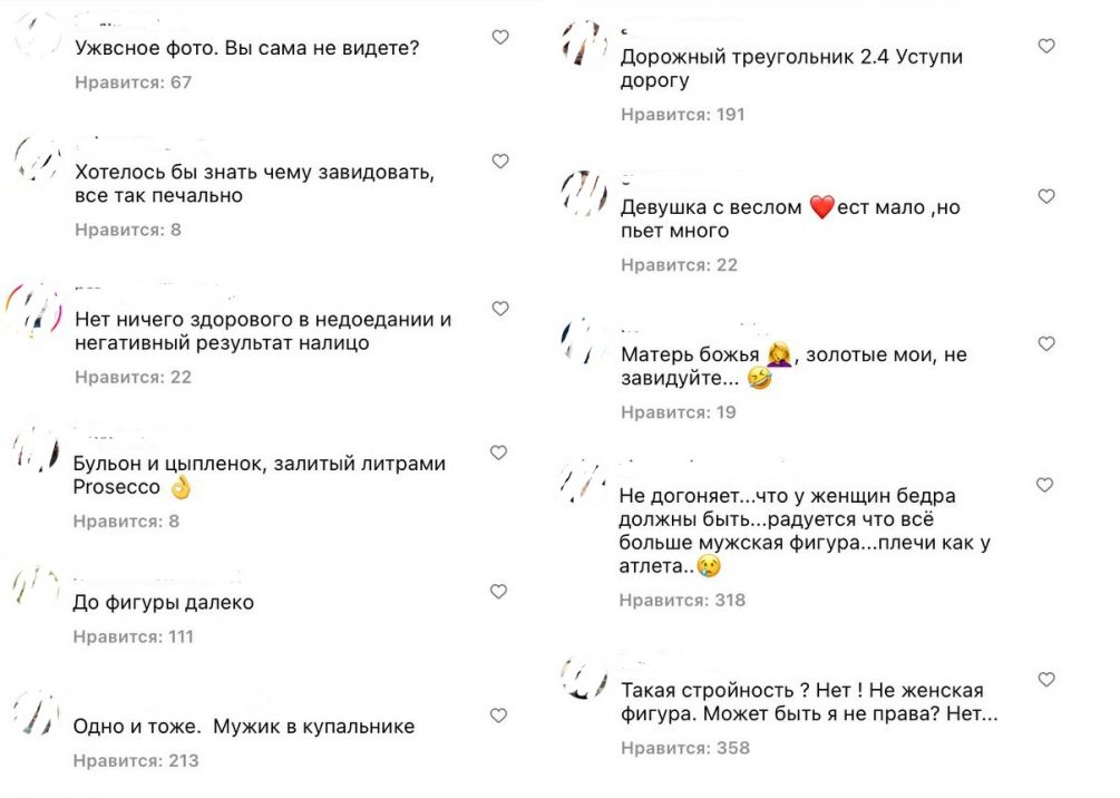 «Ужасное фото. Вы сама не видите?», «Нет ничего здорового в недоедании - негативный результат налицо», «Одно и то же. Мужик в купальнике», «Бульон и цыпленок, залитый литрами Просекко», «Дорожный треугольник. 2.4. Уступи дорогу», «Не догоняет, что у женщин бедра должны быть… Радуется, что все больше мужская фигура… Плечи как у атлета», - пишут возмущенные подписчики.