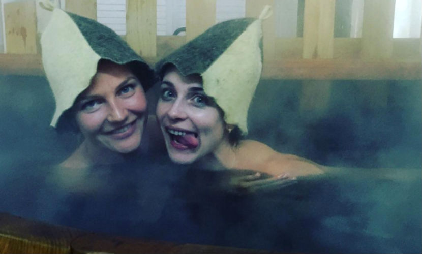 Подруги позируют в бочке-бассейне в шапочках для сауны, игриво улыбаясь на камеру.