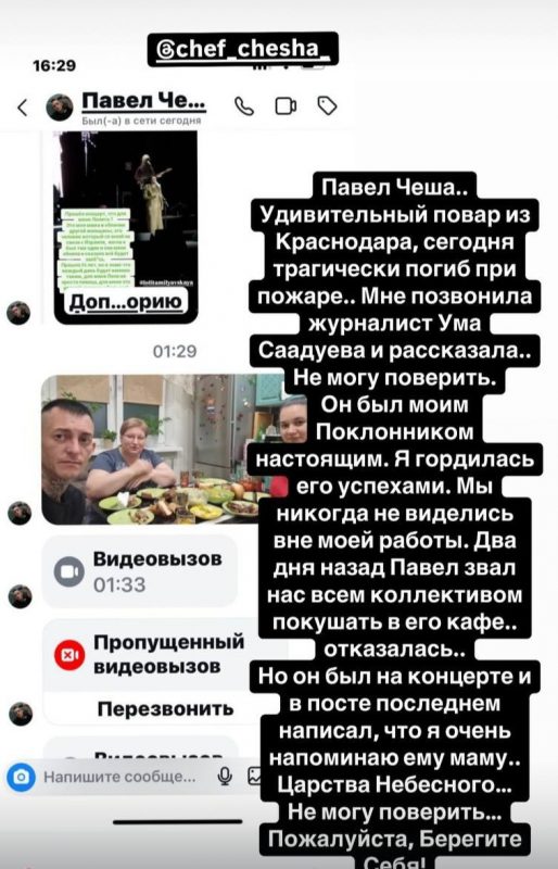 «Павел Чеша… Удивительный повар из Краснодара, сегодня трагически погиб при пожаре. Два дня назад Павел звал нас всем коллективом покушать в его кафе… Отказалась. Но он был на концерте, и в посте последнем написал, что я очень напоминаю ему маму… Царствие Небесного. Не могу поверить… Пожалуйста, берегите себя!», ‒ обратилась артистка к пользователям.