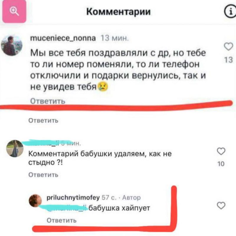 Пользователи предположили, что телефон сына Муцениеце контролируют отец с мачехой, либо кто-то другой ведет его аккаунт. Интересно, что комментарий бабушки вскоре был удален, а Тимофей весьма резко высказался в ее адрес.