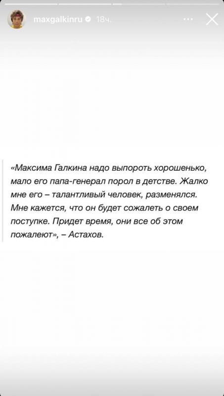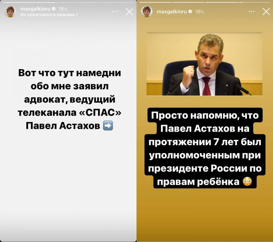 Юморист не смог остаться в стороне от такого выпада и в своем личном блоге ответил на слова Астахова. В сторис Галкин добавил, что помнит о прежнем месте работы оппонента.