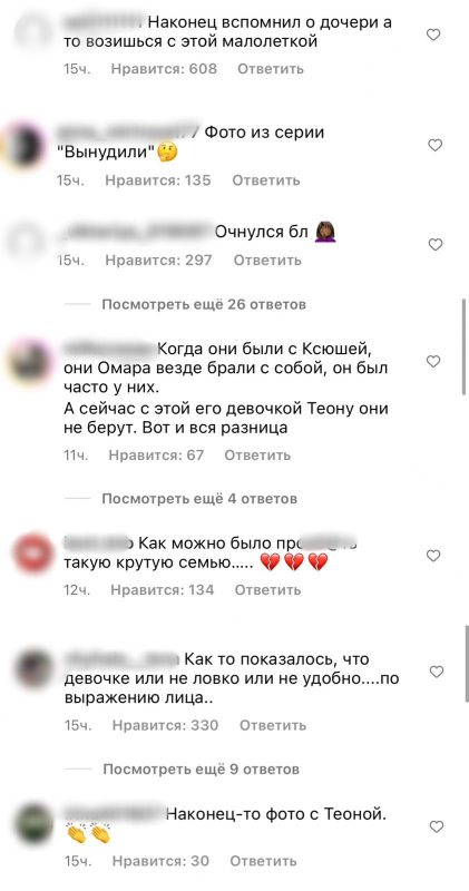 Позже Омаров решил прокомментировать и слухи вокруг того, что он забыл про дочь, не хочет с ней общаться, слишком увлёкся молодой избранницей и прочий хейт. По его словам, виной тому лишь обстоятельства, намекая на скандальный развод с матерью Теоны - Ксенией Бородиной.