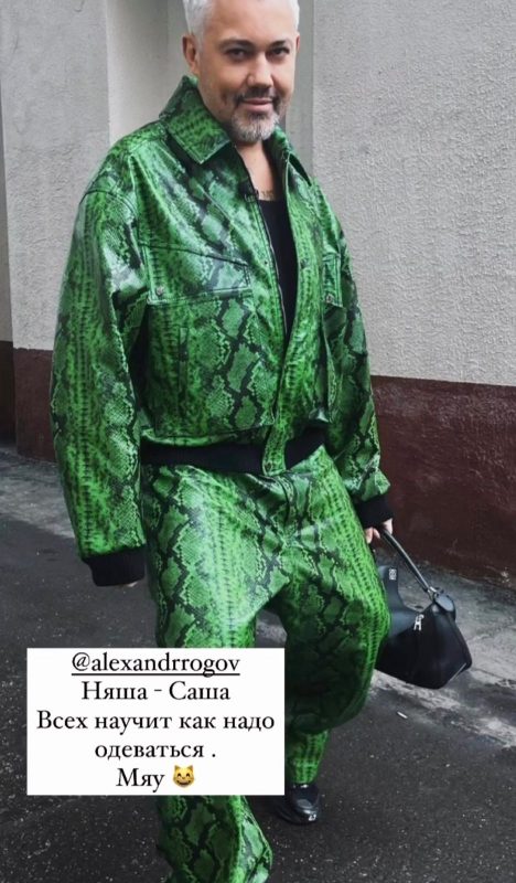 Первая носила саркастичный характер и имела под собой музыкальное сопровождение: «Песню про костюмчик». Лера разместила фото Рогова в зелёном костюме с обвисшей мотней и написала: «Няша-Саша. Всех научит, как надо одеваться. Мяу».