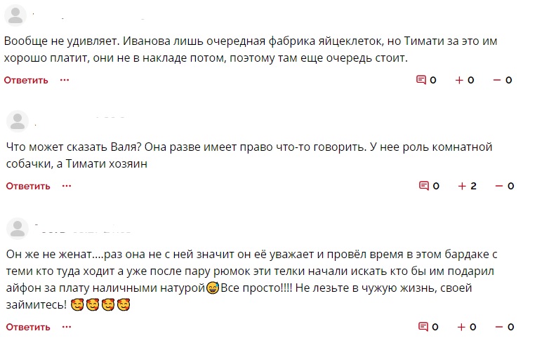 «Он же не женат... Раз он не с ней, значит, он ее уважает и провел время в этом бардаке с теми, кто туда ходит», «А что может сказать Валя на это? Она разве имеет право что-то говорить? У нее роль комнатной собачки, а Тимати – хозяин», «Вообще не удивляет. Иванова - лишь очередная фабрика яйцеклеток, но Тимати за это им хорошо платит, они не в накладе потом, поэтому там еще очередь стоит», - делятся мнением подписчики «СтарХита».
