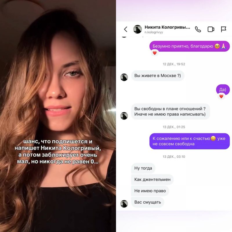 «Шанс, что подпишется и напишет Никита Кологривый, а потом заблокирует очень мал, но никогда не равен нулю», - подписала ролик девушка.