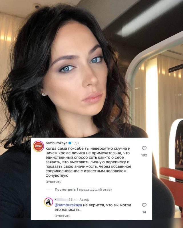 «Когда сама по себе ты невероятно скучная и ничем, кроме личика, не примечательна, то единственный способ хоть как-то о себе заявить, это выставить личную переписку и показать свою значимость - через косвенное соприкосновение с известным человеком. Сочувствую», - написала Самбурская.
