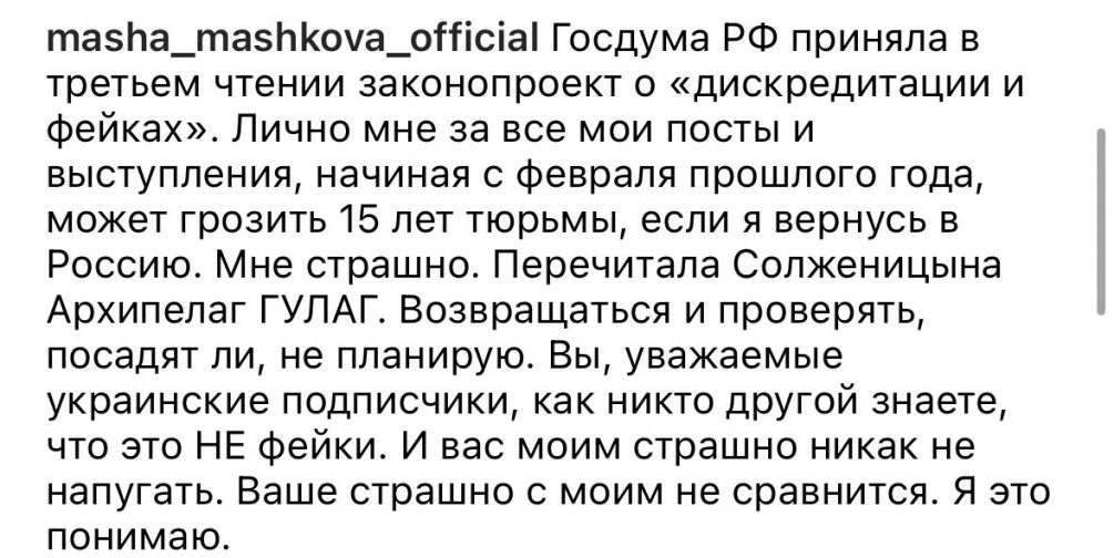 «Госдума РФ приняла законопроект о «дискредитации и фейках». Лично мне за все мои посты и выступления, начиная с февраля прошлого года, может грозить 15 лет тюрьмы, если я вернусь в Россию. Мне страшно. Возвращаться и проверять, посадят ли, не планирую», - заявила Машкова в личном блоге.
