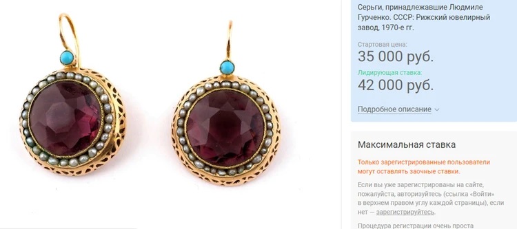 В лотах аукционного дома «Литфонд» заявлены золотые серьги Людмилы Марковны, произведенные на рижском ювелирном заводе в семидесятых годах прошлого века. Украшение с бирюзой и жемчугом заявлено со стартовой ценой 35 тысяч рублей, которую уже перекрыли желающие приобрести драгоценность.