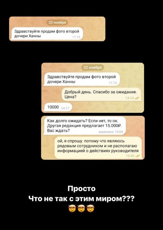 Однако ситуация дошла до абсурда и неизвестные аккаунты в «Телеграм» решили заработать на ошибке звезды. Журналистам стали активно писать и предлагать фото дочери Ханны за немаленькую сумму, а точнее 10 тысяч рублей. Сама артистка была в шоке от такого поведения людей.