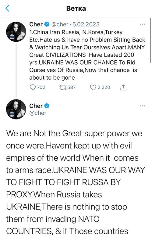«Многие великие цивилизации просуществовали 200 лет. УКРАИНА БЫЛА НАШИМ ШАНСОМ избавиться от России, теперь этот шанс вот-вот уйдет», — пожаловалась Шер в своем посте. Также артистка затронула затронула геополитические вопросы, сказав, что Китай, Иран, Россия, Северная Корея, Турция и другие страны ненавидят США.