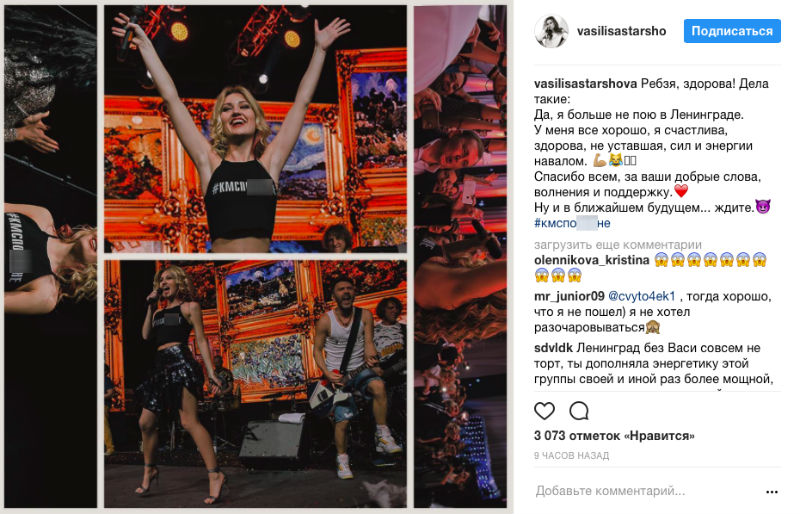 - Ребзя, здорова! Дела такие: Да, я больше не пою в Ленинграде. У меня все хорошо, я счастлива, здорова, не уставшая, сил и энергии навалом. Спасибо всем, за ваши добрые слова, волнения и поддержку. Ну и в ближайшем будущем... ждите, - написала певица.