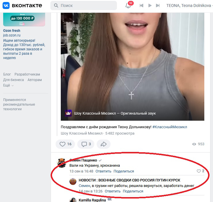 Тогда Теона Дольникова подчистила свои соцсети от антироссийских высказываний. Например, в ВК у неё с весны 2022 по осень 2023 года пробел. Это «грузинский» период.