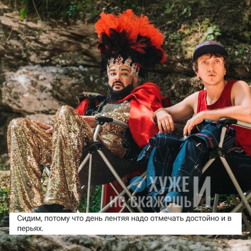 «Чего сидим? Кого ждем? Ждем фильм «Братья» с 19 декабря в кино! Сидим, потому что День лентяя (20 августа отмечается Всемирный день лени) надо отмечать достойно и в перьях», — подписал фото Филипп Киркоров.
