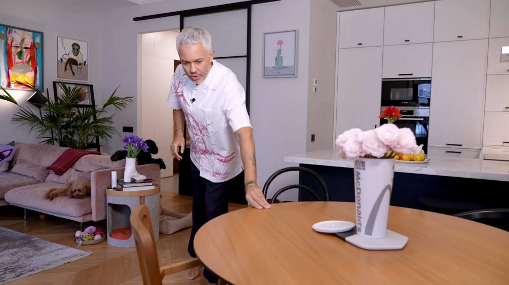 В столовой стилист показал круглый стол российского бренда на трёх ножках. Он слегка шатается, но Рогова это не смущает. По его мнению, интерьер не обязан быть идеально выверенным.