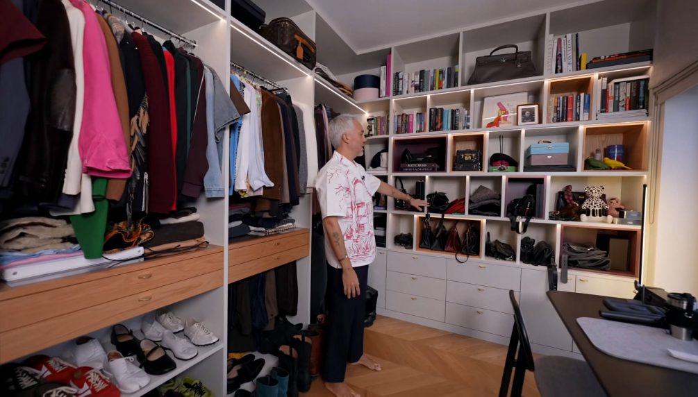Отдельной гордостью Рогов назвал гардеробные и обилие света. В квартире десять окон, и каждое расположено напротив отдельной комнаты. В старой гардеробной хранятся заброшенные сценические костюмы, в новой – актуальные модные и люксовые вещи. Среди них обувь Balenciaga и чёрная кожаная куртка от Канье Уэста, размещённые в шкафах без створок.