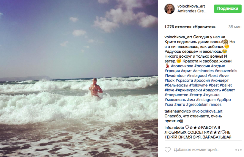 - Сегодня у нас на Крите поднялись дикие волны! Но я в них плескалась, как ребенок. Радуюсь сердцем и веселюсь. Никого вокруг и только волны! И ветер. Красота и свобода жизни! - написала Волочкова под обнаженным снимком.