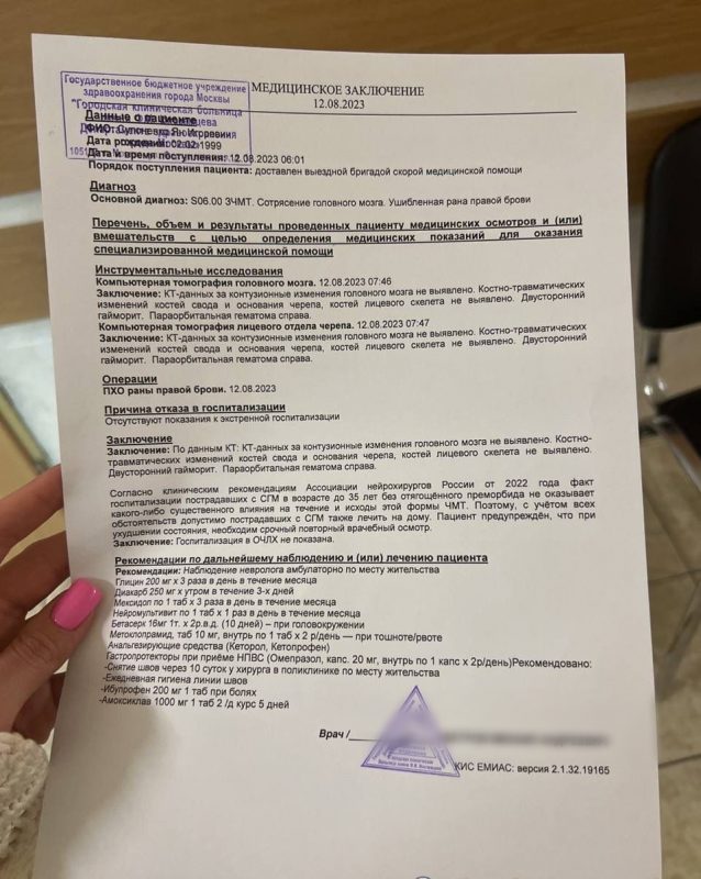 Прибывшая на место карета «скорой помощи» забрала 24-летнего парня в больницу. Во время осмотра врачи зафиксировали у Супоненко ушибы правой брови, закрытую черепно-мозговую травму и сотрясение головного мозга, наложили несколько швов, назначили лечение и отпустили домой.