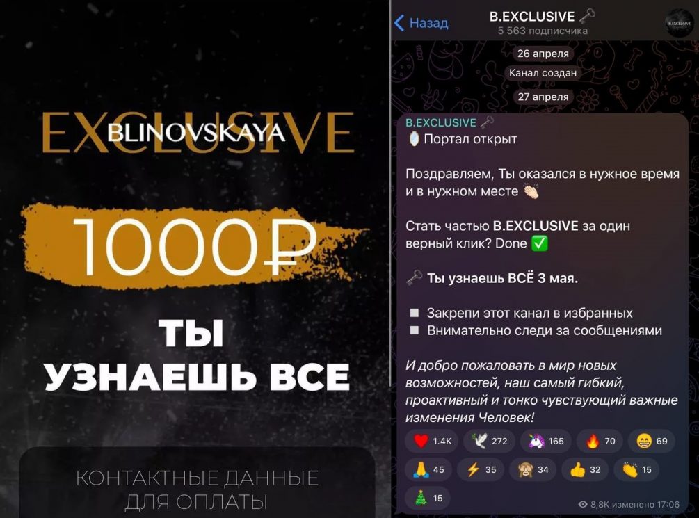 Так, в день ареста создательницы «Марафона желаний» в ее социальных сетях появилось загадочное сообщение с многообещающим призывом «узнать все» за 1000 рублей. Тех, кто откликнулся на призыв, а таких набралось больше пяти тысяч человек, перенаправили в закрытый чат в Telegram.