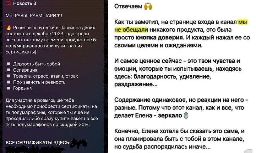 «Как ты заметил, на странице входа в канал мы не обещали никакого продукта. Это была просто кнопка доверия. И каждый нажал ее со своими целями и ожиданиями», - пишут представители курсов звездного коуча, - «Содержание одинаковое, но реакции на него - разные. Потому что этот канал, как и все, что делает Елена – зеркало».