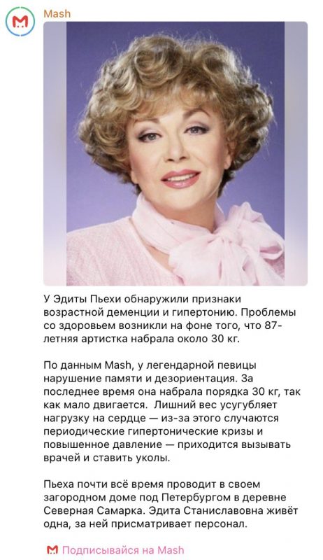 «У легендарной певицы нарушение памяти и дезориентация. За последнее время она набрала порядка 30 кг, так как мало двигается. Лишний вес усугубляет нагрузку на сердце — из-за этого случаются периодические гипертонические кризы и повышенное давление», — пишут в СМИ.