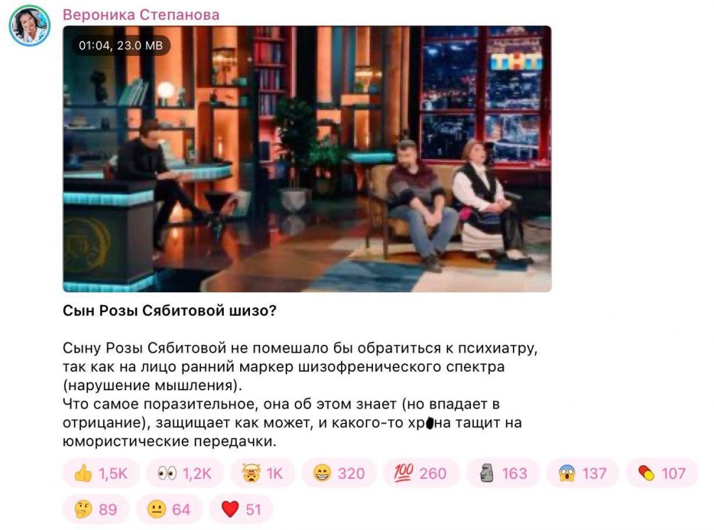 «Сыну Розы Сябитовой не помешало бы обратиться к психиатру, так как на лицо ранний маркер шизофренического спектра (нарушение мышления). Что самое поразительное, она об этом знает (но впадает в отрицание), защищает как может, и какого-то хр*на тащит на юмористические передачки», — написала эксперт.