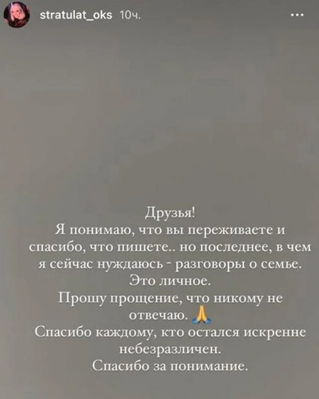 «Друзья! Я понимаю, что вы переживаете, и спасибо, что пишете… Но последнее, в чем я сейчас нуждаюсь, это разговоры о семье. Это личное. Прошу прощения, что никому не отвечаю. Спасибо каждому, кто остался небезразличен. Спасибо за понимание», - написала в сторис она.