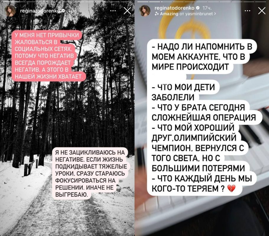 «У меня нет привычки жаловаться в социальных сетях, потому что негатив всегда порождает негатив. А этого в нашей жизни хватает. Я не зацикливаюсь на негативе: если жизнь подкидывает тяжелые уроки, сразу стараюсь фокусироваться на решении, иначе не выгребаю», - написала в сторис телеведущая.