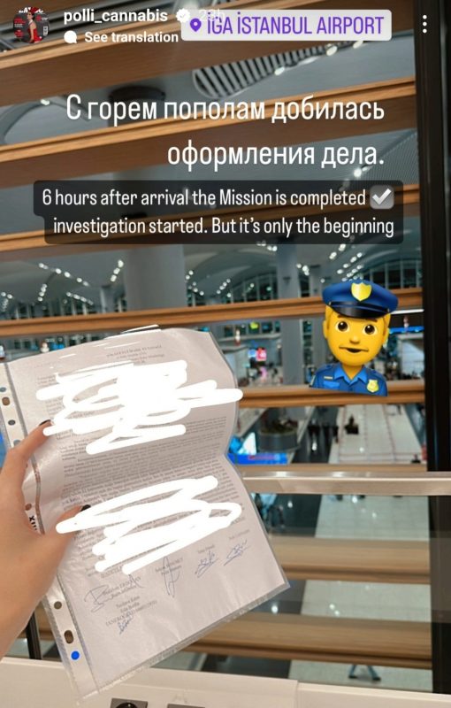 Каннабис связалась с белорусской полицией, прежде чем вылететь обратно в Стамбул, чтобы подать заявление о краже. Она настояла на том, чтобы ей дали переводчика. В итоге, ей удалось возбудить дело и получить необходимую документацию. Как только бюрократические вопросы были решены, Полли вернулась домой, выразив надежду, что украденные драгоценности будут возвращены.