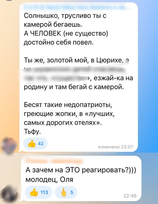 «Оля - молодец! Одним взглядом показала, кто есть кто», «Они свиньи невоспитанные, обращаются к незнакомому человеку на «ты». Я бы попросила Ольга Игоревна!», «Трусливо бегали они с камерой, а человек (не существо) достойно себя повел!», «Они обвиняют её за то, что она в Цюрихе, но сами находятся там же. Цирк!», - негодовали фолловеры.