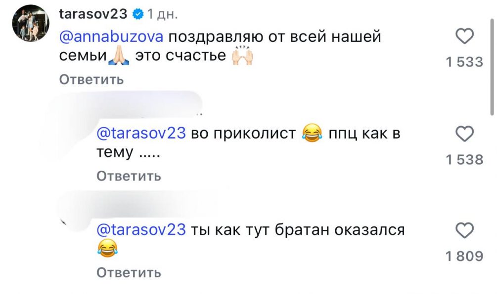 В комментариях под постом Анну завалили приятными словами и поздравлениями с пополнением в семье. Неожиданно для многих присоединиться к добрым комментариям решил и бывший супруг Ольги Бузовой Дмитрий Тарасов.
