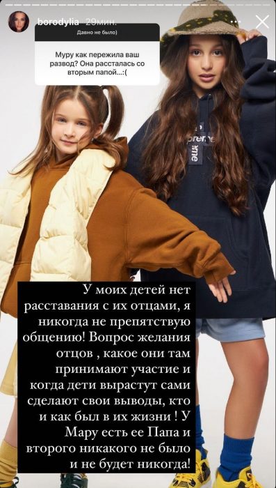 Также Бородина призналась, что со своей свекровью, правда не уточнила с какой именно, она сохранила хорошие отношения. Они даже переписываются в соцсетях и, по всей видимости, обмениваются последними новостями или обсуждают вопросы, касаемые детей.