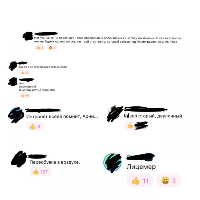 «Переобувка в воздухе», «Он же в 22 году больше всех визжал», «Aгa... Лицемерный, в 22 году другие песни пел», «Интернет всё помнит, Арни..», «Нет уж, Арни, не проканает. Твое обращение к россиянам в 22-м году мы помним. И как ты говорил, что мы будем жалеть так же, как твой отец-фриц, который воевал под Ленинградом, помним тоже», — пишут рассерженные пользователи Сети.