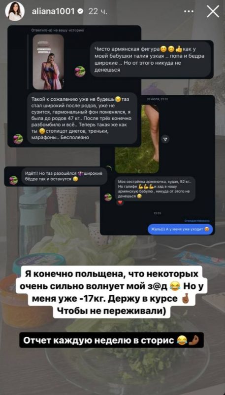 «Я, конечно, польщена, что некоторых очень волнует мой зад. Но у меня уже минус 17 килограммов. Держу в курсе. Чтобы не переживали. Отчёт каждую неделю», ‒ заверила обеспокоенных пользователей Устиненко.
