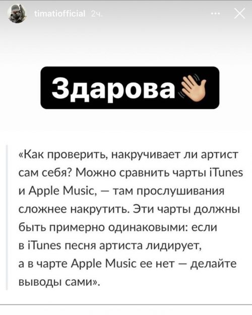 В Интернете предположили, что певице и посвящены stories Тимати. Рэпер поинтересовался, знают ли артисты, чьи треки занимают первое место в iTunes, что они номер один только на этой музыкальной платформе. А стоит эта услуга, по словам Юнусова, 20 тысяч рублей.