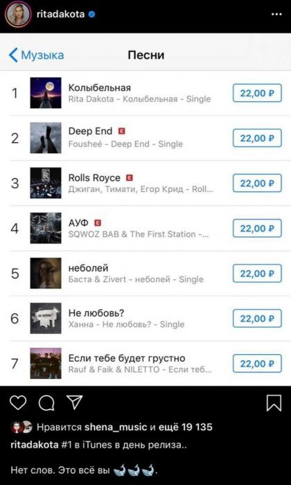 Певица гордо заявила в своем блоге в Telegram, что трек стал лидером новинок спустя всего сутки после релиза. При этом, Рита даже не просила поддержки у других артистов.