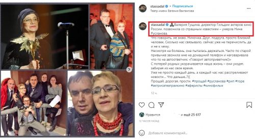«Валерия Гущина, директор Гильдии актеров кино России, позвонила со страшным известием – умерла Нина Русланова. Ниночка. Друг, подруга, просто близкий человек. Сколько нас связывало, сейчас уже не перечислить, да и не к чему. Уже не просто каждый день, а каждый час нас расстреливают новости… Что дальше..?», - эмоционально высказался актер в Instagram.