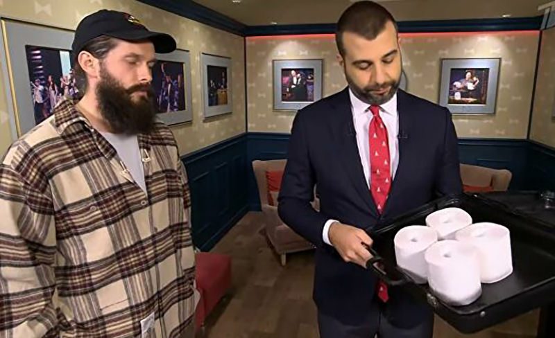 В начале передачи актер и режиссер Григорий Добрыгин вручил Урганту чемодан, в котором лежали четыре рулона туалетной бумаги. Шоумен спросил, почему Добрыгин принес так мало. Режиссер ответил, что больше не было. «Ладно, сегодня продержусь, завтра будем решать», — заключил ведущий шоу.