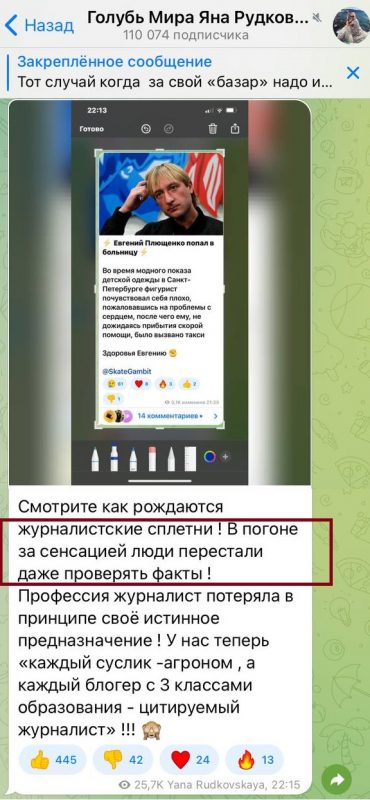 Такие заявления не смогла оставить без внимания его супруга, Яна Рудковская. В своем Telegram-канале звездный продюсер заявила, что в погоне за сенсацией люди перестали проверять факты.