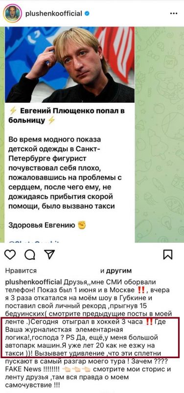 На днях в СМИ появилась информация, что Евгений Плющенко попал в больницу из-за плохого самочувствия во время модного показа детской одежды дизайнера Екатерины Давыдовой. Сообщалось, что в ходе мероприятия журналисты «НТВ» обратили внимание на состояние фигуриста, а после сообщили, что спортсмен прямо в разгар вечера отправился в клинику на такси.