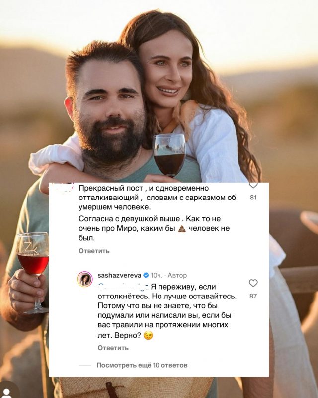 «И как предсказывала в своих постах обо мне Лена Миро: да он скоро сбежит от нее, максимум два года протянут! Но вот незадача: Лена Миро уже, к сожалению, не сможет ни писать посты, ни предсказывать, а мы всё ещё тут, живём в залитой золотом Калифорнии, растим красивых детей и счастливы», - высказалась Зверева.