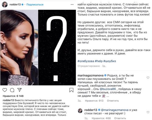 «Вместо пятничного батла, у нас акция поддержки Ольги Бузовой. Я чисто по-человечески сочувствую Оле, которой все никак не удаётся найти крепкое мужское плечо. С плечами сейчас тоже, видимо, мировой кризис. Отчаиваться ей не стоит, барышня видная, находчивая, все впереди. Только счастья пожелать могу и семь футов под килем!», - написал Родион.