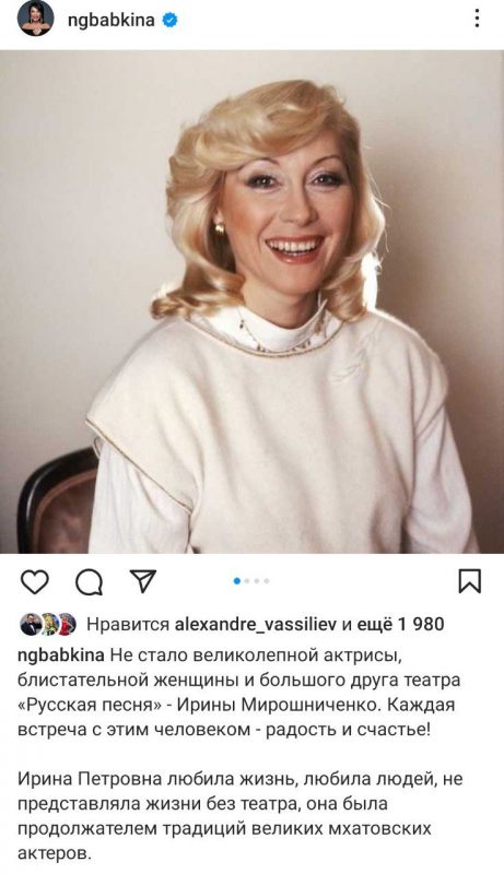 По словам Надежды Бабкиной, Ирина Мирошниченко любила жизнь, людей и никогда ни на что не жаловалась. Каждая встреча с актрисой была для Бабкиной радостью и счастьем.