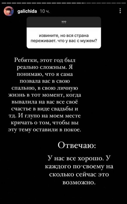 «Ребятки, этот год был реально сложным. Я понимаю, что я сама позвала вас в свою спальню, в свою личную жизнь в тот момент, когда вывалила на вас все свое счастье в виде свадьбы. И глупо на моем месте кричать о том, чтобы вы эту тему оставили в покое. Отвечаю: у нас все хорошо. У каждого по-своему, насколько это сейчас возможно», — поделилась блогер.