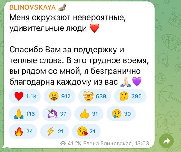 «Меня окружают невероятные, удивительные люди», - гласило сообщение, - «Спасибо Вам за поддержку и теплые слова. В это трудное время, вы рядом со мной, я безгранично благодарна каждому из вас».
