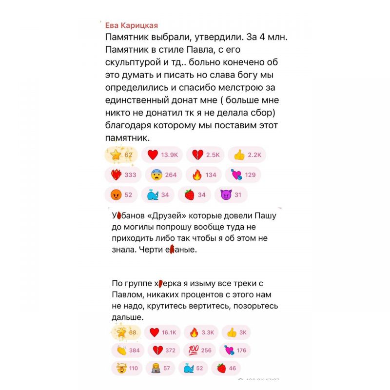«Памятник за 4 млн, в стиле Павла, с его скульптурой и так далее. Больно, конечно, об это думать и писать, но слава Богу мы определились. И спасибо Меллстрою за единственный донат мне, благодаря которому мы поставим этот памятник», — написала в своем Telegram-канале Карицкая.