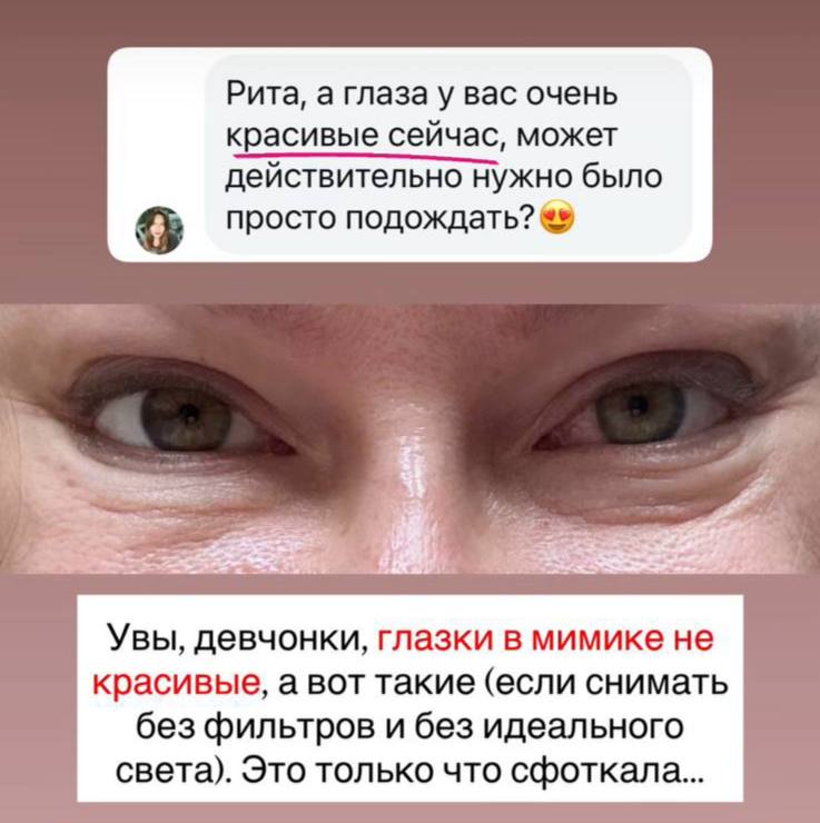 По словам артистки, хирург, к которому она обратилась, уверял, что процедура будет простой и безопасной. Более того, певица доверяла этому специалисту, так как к нему уже обращались её знакомые. Но реальность оказалась далека от ожиданий: вместо удаления грыж доктор провёл липофилинг - ввёл собственный жир Риты в область век в качестве филлера, что привело к появлению жировых складок под глазами, которых ранее у певицы не было.
