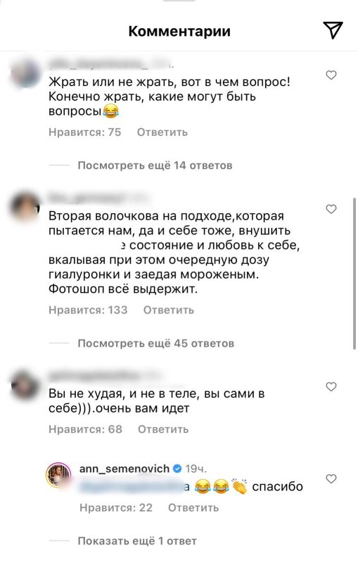 «Если бы ты принимала себя, то не фотошопила бы фотографии», «Как будто беременная», «Жрать или не жрать - вот чем вопрос!», «Вторая Волочкова на подходе, которая пытается нам, да и себе тоже внушить [офигительное] состояние и любовь к себе, вкалывая при этом очередную дозу гиалуронки и заедая мороженым. Фотошоп все выдержит», — писали фолловеры в комментариях.